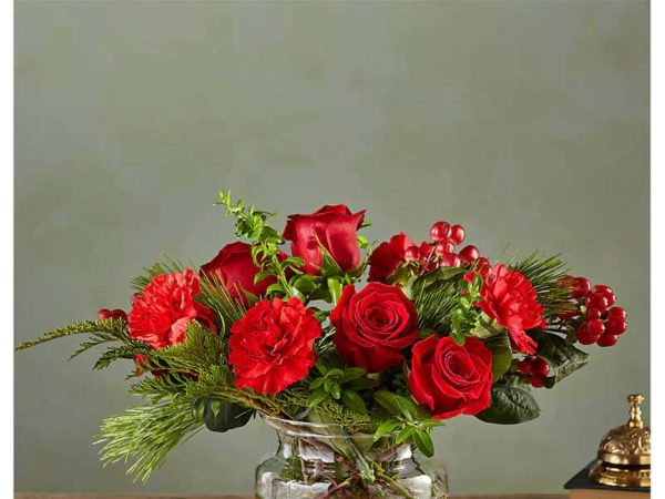 Seductive and serious, this deep crimson bouquet of roses, carnations, boxwood and hypericum berries readies any room for a grown–up, classy soiree.