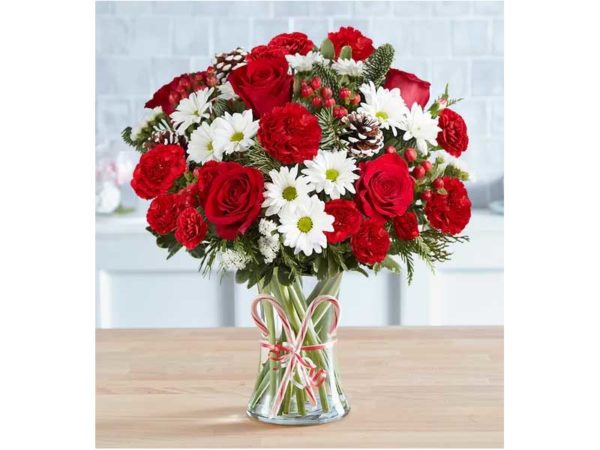 Bring joy to their world in merry, minty style. Our charming holiday bouquet is gathered with a swirl of red and white blooms, fragrant evergreens and snowy-tipped pinecones inside a clear glass vase. For a sweet finishing touch, we’ve added a pair of candy canes tied with ribbon. It’s a festive surprise sure to get them into the spirit of the season.