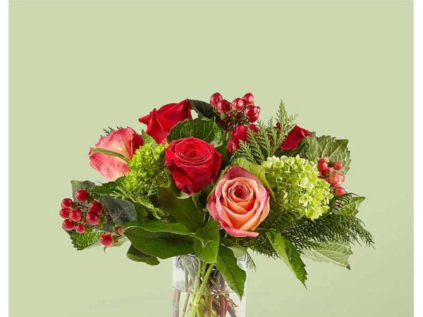 Deck the halls brighter than ever this year with our Tinsel Town Bouquet dressed in peachy roses, green hydrangeas and red roses.